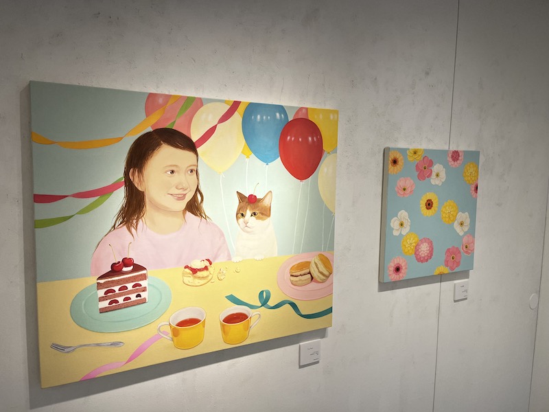 The origin of Yuka Omura’s artistic practice lies in a childhood memory—specifically, the excitement she felt just before a party began. Her works feature figures, animals, flowers, and food, all rendered in gentle, soft hues. Each motif is meticulously detailed, with food in particular depicted so vividly that viewers can almost sense its texture and aroma.