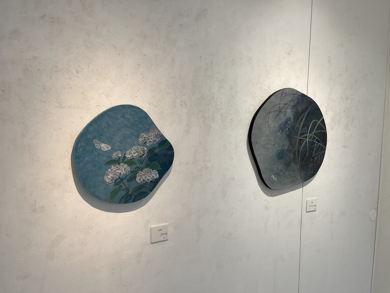 In this exhibition, she explores materials and techniques rarely used in traditional Japanese painting, such as irregularly shaped panels, effect pigments, and screen fabric. The irregular panels gently unravel the boundaries of the pictorial surface, allowing light and color to diffuse more freely. The translucency of the screen material enhances the effects of back-painting, creating a delicate, silk-like appearance. Through the universal motif of grasses and flowers, her work seeks to let even the invisible—light, sound, and atmosphere—resonate between line and empty space, establishing a world of artworks imbued with quiet and profound afterglow.