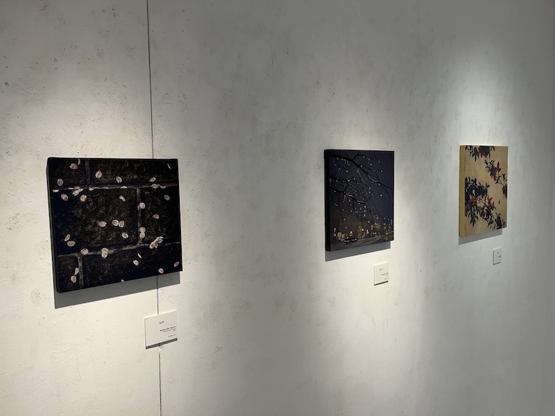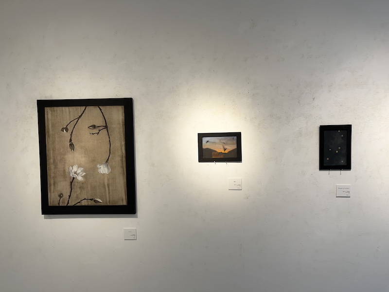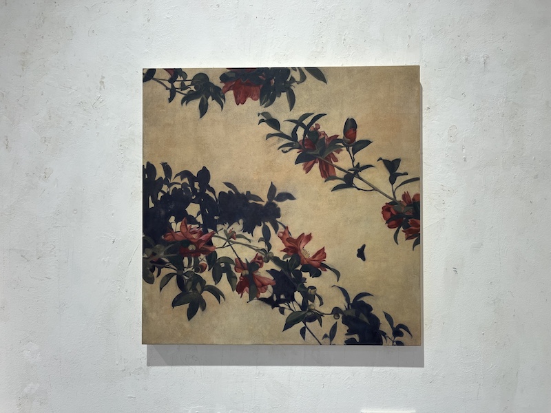 枝や花の輪郭がつくる“間”や空間は、鑑賞者に想像の余地を与え、語られない物語を心の中に広げる。 その静謐な世界観は、一瞬のきらめきや過ぎゆく時の余韻をひとつの「風景」として映し出すものであり、今回の個展テーマ「ひかりの余韻」も、そうした感覚の延長線上にある。